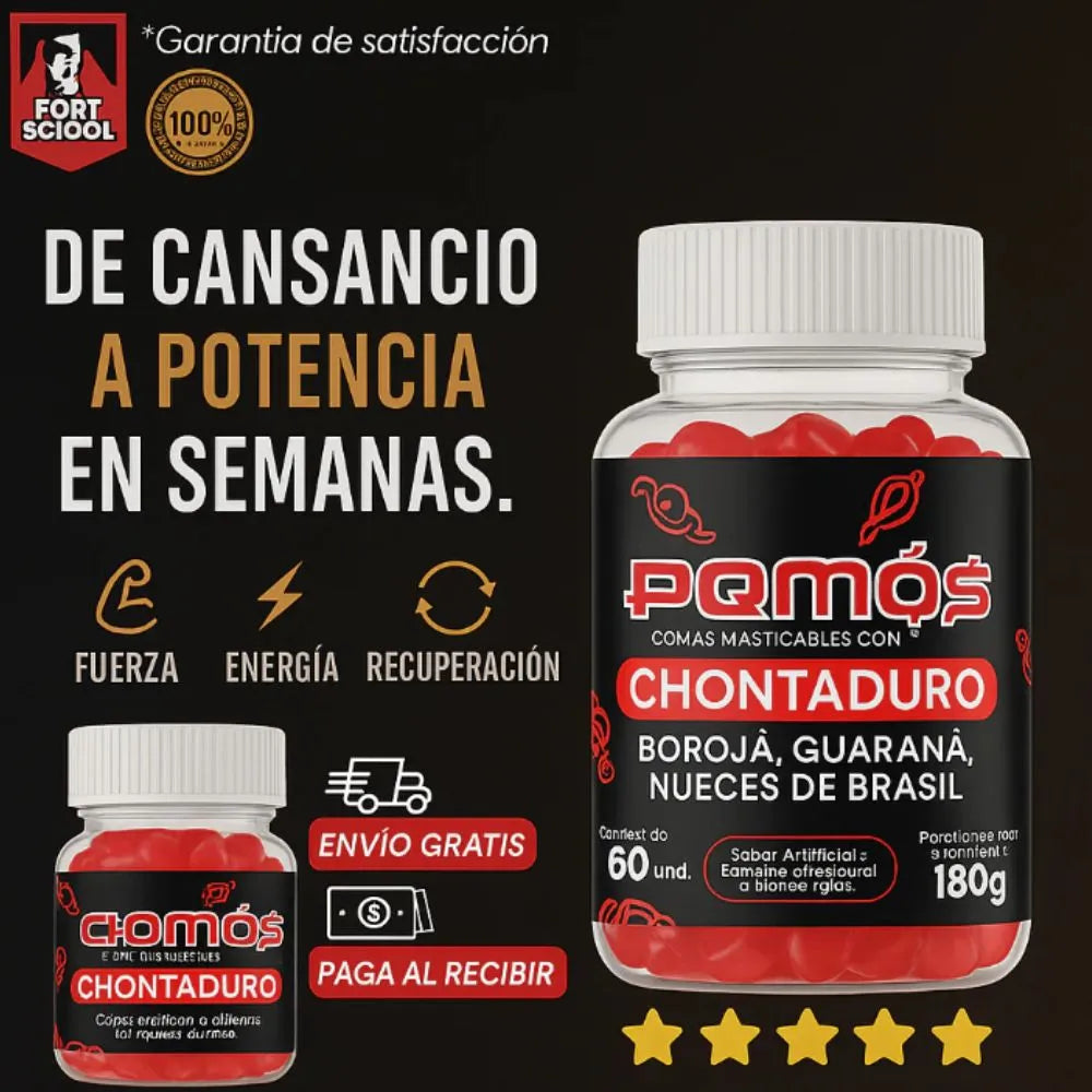 GOMAS PQMOS son gomitas funcionales con guaraná, chontaduro, borojó y nuez de Brasil, recomendadas para adultos (ellos y ellas) que buscan apoyar su energía y vitalidad.